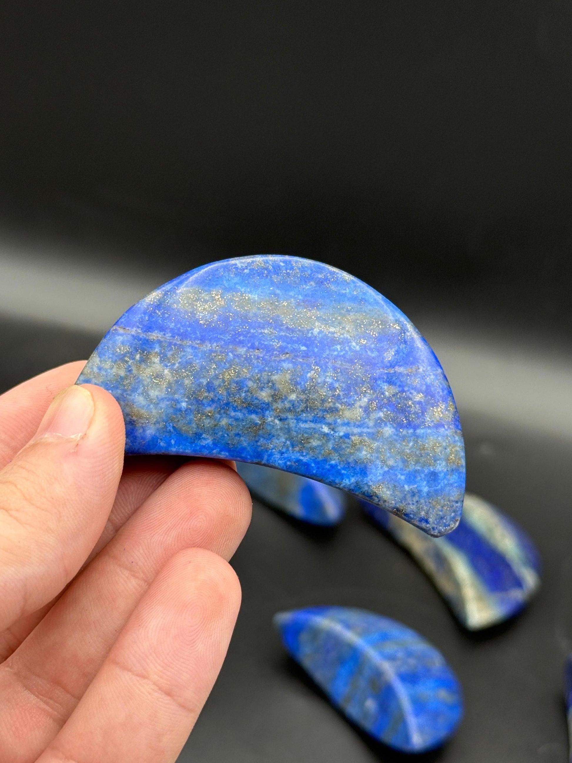 A captivating natural Lapis Lazuli moon, hand-polished to highlight its deep royal blue hue and golden pyrite sparkles. This crescent-shaped gemstone is perfect for collectors, healers, and those who appreciate celestial décor.