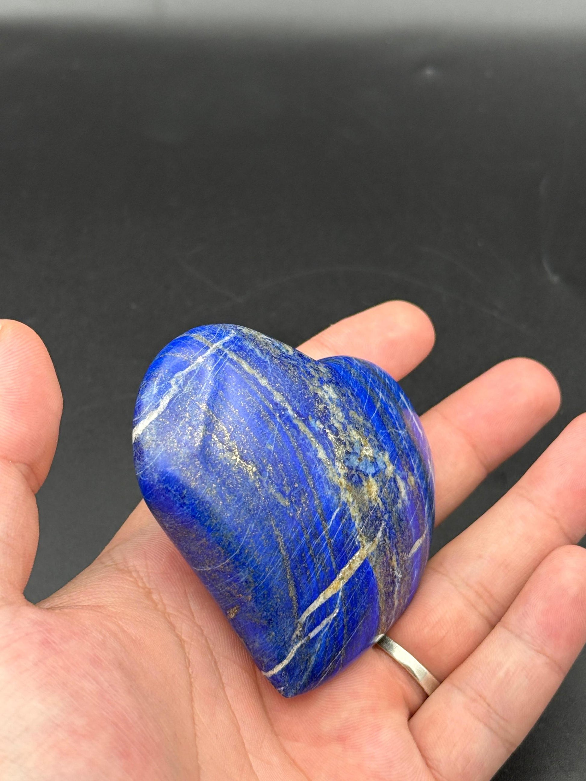 A beautiful natural Lapis Lazuli heart, finely polished and radiating deep royal blue tones with shimmering golden pyrite flecks. This crystal heart symbolizes love, wisdom, and truth—perfect for healing, décor, or gifting.